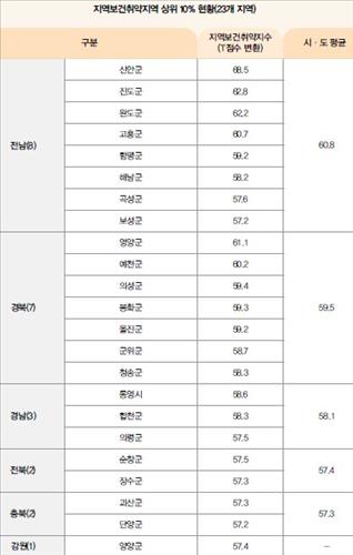 또 경남은 통영시(58.6)·합천군(58.3)·의령군(57.5) 등 3곳, 전북은 순창군(57.5)·장수군(57.3) 등 2곳, 충북은 괴산군(57.3)·단양군(57.2) 등 2곳, 강원은 양양군(57.4) 1곳이 보건 취약 정도가 심각한 수준이었다.