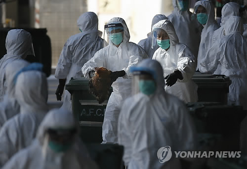 | △ 홍콩, AI 막으려 중국산 가금류 수입 중단 (AP=연합뉴스) 홍콩 정부는 중국 광둥성 후이저우 농가에서 수입한 생닭 표본에서 신종 조류인플루엔자(AI) 바이러스가 검출됨에 따라 도매시장에서 가금류 1만5천 마리를 살처분하고 3주간 중국으로부터 가금류 수입을 중단키로 했다고 31일(현지시간) 밝혔다. 사진은 안전보호 복장을 한 보건 요원들이 살처분된 닭들을 쓰레기통으로 던져넣는 모습. marshal@yna.co.kr |