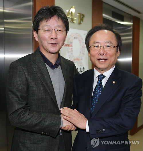 | △ 여당 원내대표 출마자 악수 (서울=연합뉴스) 백승렬 기자 = 새누리당 원내대표에 출마한 이주영(오른쪽)·유승민 의원이 1일 여의도 당사에서 만나 인사하고 있다. |