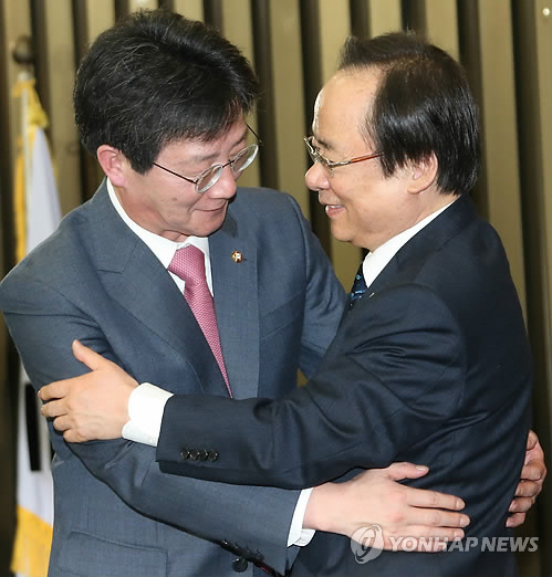 | △ 여당 원내대표 선거 승패자 포옹 (서울=연합뉴스) 백승렬 기자 = 새누리당 새 원내대표로 선출된 유승민 의원이 2일 국회에서 열린 의원총회에서 패배한 이주영 의원과 포옹하고 있다. |