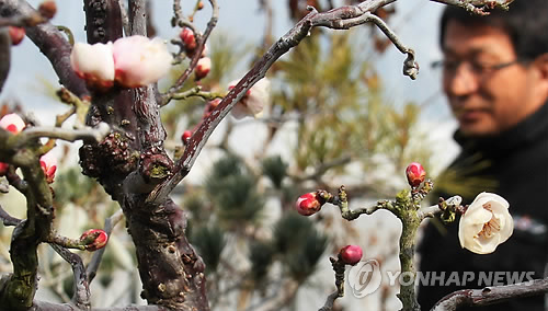 | △ 입춘 앞두고 만개한 매화 (옥천=연합뉴스) 박병기 기자 = 입춘(4일)을 이틀 앞두고 2일 충북 옥천군 군북면의 한 분재원에서 20년된 매화가 꽃망울을 터트렸다.2014.2.2 bgipark@yna.co.kr |