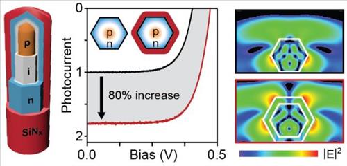 | △ 유전체 코팅으로 나노선 태양전지 효율 2배 향상. 유전체(질화규소) 껍질이 도입된 실리콘 나노선 태양전지 그림(왼쪽), 유전체 껍질 도입으로 실리콘 나노선 태양전지의 광전류가 ~80% 증가(가운데), 유전체 껍질 도입 전후로 광학 안테나 효과를 분석한 전자기학 계산 결과(오른쪽). |