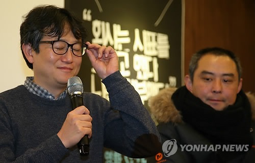 | △ 영화 '산다' 토크쇼 (서울=연합뉴스) 양지웅 기자 = 2일 오후 서울 종로구 참여연대에서 열린 KT 노동자들의 삶을 그린 영화 '산다' 상영회에서 이해관 KT새노조 전 위원장(왼쪽)과 김영수 희망연대노조 케이블방송 비정규직 지부장이 인사말을 하고 있다. |