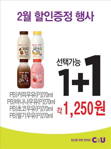 CU는 커피우유 등 자체상표(PB) 가공유 4종류를 사는 소비자에게 하나를 더 주는 '1+1' 행사를 진행하고, 서울 딸기우유 등 가공유 25종과 남양 맛있는 우유 등 흰우유 3종, 동원 드링킹요구르트 딸기 등 발효유 18종, 총 50여 유제품에 대해서는 '2+1' 행사를 기획했다.