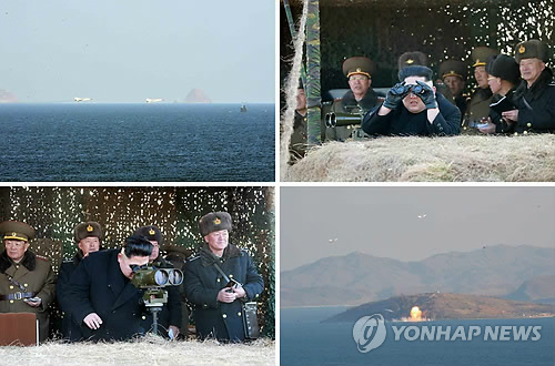 | △ 목표 타격훈련 중인 전투비행기와 시찰나온 김정은 (서울=연합뉴스) 북한 항공 및 반항공군(공군) 소속 전투비행기들이 미군과의 해상전투 상황을 가정해 실시된 공군·해군 합동 해상목표물 타격 훈련에 참가하고 있다. 시찰나온 김정은 국방위원회 제1위원장은 다양한 쌍안경을 동원해 이 모습을 주의깊게 지켜봤다. 노동신문은 31일 이 사진을 보도하며 정확한 촬영일자와 장소를 밝히지 않았다. 2015.1.31 nkphoto@yna.co.kr |