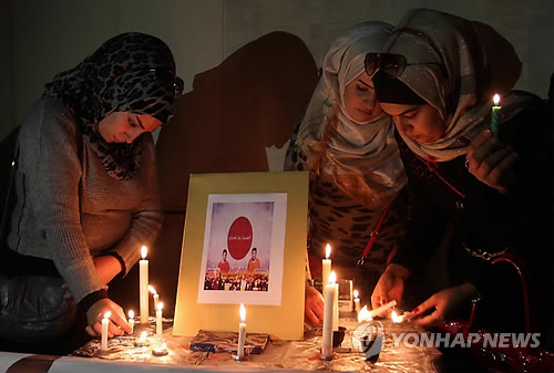 | △ 2일(현지시간) 요르단 암만의 일본 대사관 앞에서 사람들이 수니파 원리주의 무장단체 '이슬람국가'(IS)에 의해 살해된 일본인 인질 유카와 하루나(42)씨와 고토 겐지(47)씨를 추모하는 촛불을 켜고 있다.(EPA=연합뉴스) |