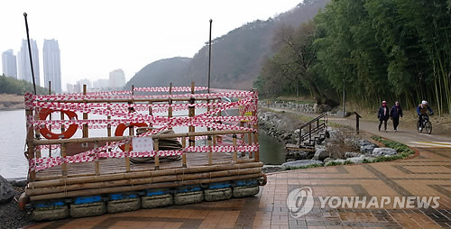 | △ 운항 중단된 태화강 뗏목 (울산=연합뉴스) 허광무 기자 = 1일 울산 태화강 둔치에 유람용 뗏목이 방치되고 있다. 남구가 운영하는 이 뗏목은 지난해 11월 전복사고를 내고 운항이 중단됐다.2014.3.1<<지방기사 참조>> hkm@yna.co.kr |