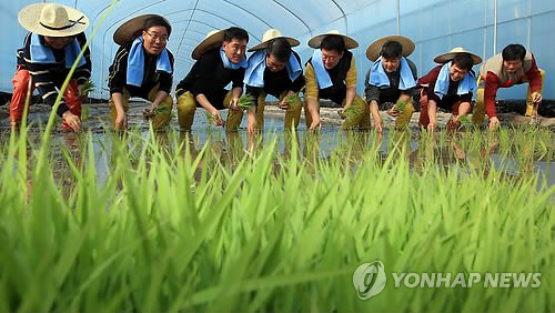 | △ 올해도 풍년을 기원하며 (이천=연합뉴스) 홍해인 기자 = 절기상 입춘인 4일 오전 경기도 이천시 호법면 안평리 비닐하우스 논에서 열린 임금님표 이천쌀 전국 첫 모내기 행사에서 마을 주민 등 행사 참가자들이 모내기를 하고 있다. 행사에서 이천시와 호법농협은 하우스 2개동 892㎡에 극조생종 설봉1호와 진부올벼 등 2개 품종을 심었다. 이날 심은 모는 6월말 수확할 예정이다. 2015.2.4 hihong@yna.co.kr |