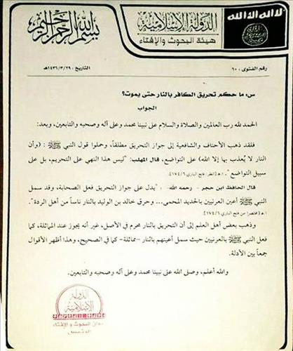 (두바이=연합뉴스) 강훈상 특파원 = 수니파 무장조직 '이슬람국가'(IS)가 요르단 공군 조종사를 산채로 불태워 죽인 직후 트위터를 통해 이를 정당화하는 파트와(이슬람 율법 해석)를 제정해 배포했다.