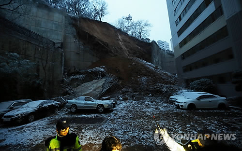 | △ 광주 옹벽 붕괴 사고 현장 (광주=연합뉴스) 박철홍 기자 = 5일 오전 옹벽이 붕괴해 차량 10여대가 매몰된 광주 남구 봉선동의 모 아파트에서 경찰과 소방당국이 추가 붕괴우려에 주민을 대피시키고, 출입을 통제하고 있다. 2015.2.5 pch80@yna.co.kr |