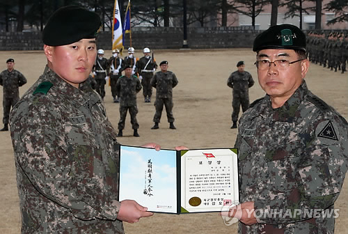 | △ 수류탄 놓친 훈련병 구한 소대장에 참군인상 (논산=연합뉴스) 양영석 기자 = 김요환 육군참모총장이 5일 육군훈련소를 방문해 수류탄 훈련과정에서 위기에 처한 훈련병의 구한 김현수 상사에게 참군인상을 전달하고 있다. 2015.2.5 |