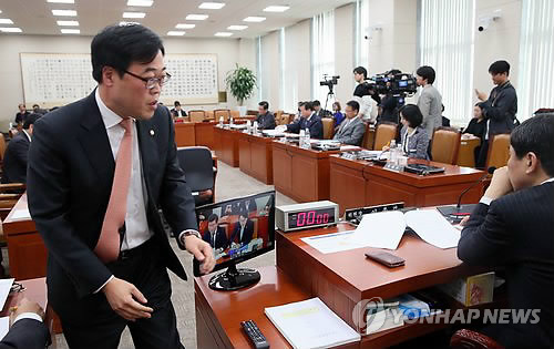 | △ 박상옥 후보자 인청특위, 시작부터 여야 기싸움 (서울=연합뉴스) 진성철 기자 = 5일 국회 대법관 박상옥 임명동의에 관한 인사청문특별위원회에서 새정치민주연합 김기식 의원(왼쪽)이 이종걸 위원장에게 다가가고 있다. 이날 회의는 박 후보자의 대법관 자격을 두고 야당 의원들이 반발해 정회됐다. |