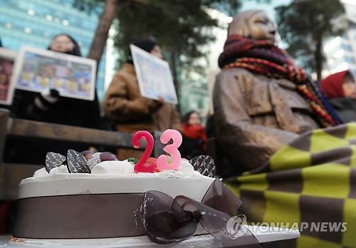 | △ 1월7일 서울 종로구 일본대사관 앞에서 열린 23주년 일본군 '위안부' 문제해결을 위한 수요집회(1160차)에서 소녀상 옆에 23주년을 기념하는 케이크가 놓여 있다. |