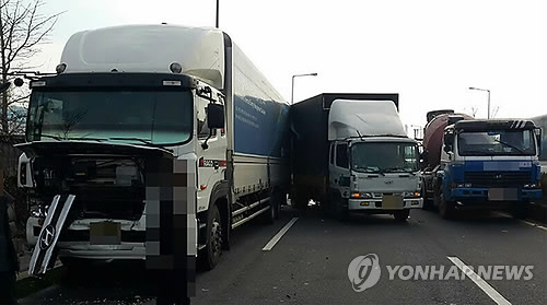 | △ 울산 아산로 4중 추돌사고 현장 (울산=연합뉴스) 3일 오전 울산시 북구 염포동 아산로에서 발생한 4중 추돌사고 현장의 모습. 이 사고로 도로변 쓰레기 수거 작업을 하고 있던 북구청 소속 근로자 등 4명이 중경상을 입고 병원으로 이송됐다. 2015.2.3 << 울산지방경찰청 >> yongtae@yna.co.kr |