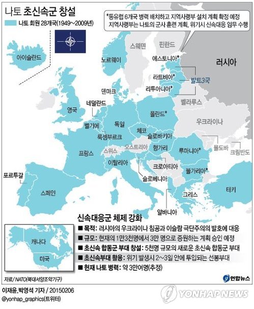 이를 위해 나토 지도부는 지난해 9월 신속대응군을 증강하고 아울러 새로운 합동 부대를 창설하기로 합의했다.