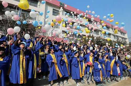 | △ '꿈풍선' 날리는 졸업생 (서울=연합뉴스) 최재구 기자 = 6일 서울 동대문구 전동중학교에서 열린 졸업식에서 졸업생들이 각자의 희망을 적어넣은 풍선을 하늘로 날리고 있다. |
