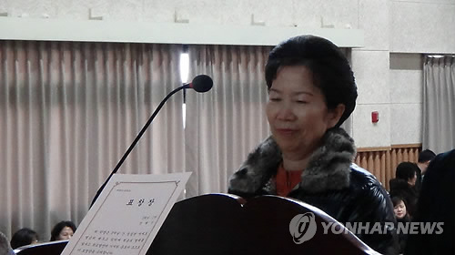 | △ 중학교 졸업하는 왕언니 성락순씨 (청주=연합뉴스) 6일 청주시 원봉중학교에서 열린 졸업식에서 성락순(62)씨가 표창장을 받고 있다. 초등학교를 졸업하지 못한 성씨는 배움에 대한 열정을 포기하지 않고 2012년 이 중학교에 입학, 3년간의 교육과정을 마치고 이날 졸업했다. 2015.2.6 <<원봉중학교 제공>> vodcast@yna.co.kr |