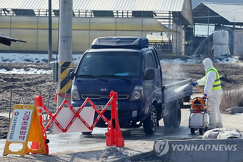 | △ 제천서 '한우 구제역' 발생…방역 강화 (제천=연합뉴스) 전창해 기자 = 충북 제천시 금성면 사곡리의 한 농가에서 한우 1마리가 구제역에 감염된 것으로 확인된 가운데 6일 이 마을 입구에 설치된 방역초소에서 검역본부 직원이 축산관련 차량을 대상으로 방역소독을 하고 있다. 2015.2.6 jeonch@yna.co.kr |