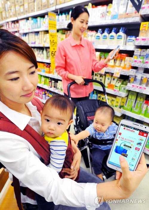 | △ (서울=연합뉴스) 10~20대 못지않게 모바일에 익숙하면서도, 그 이상의 구매력을 갖춘 30대 여성과 주부들이 모바일 쇼핑 시장의 폭발적 성장을 이끌고 있다. 사진은 한 대형마트 모바일 앱을 사용하는 주부. << 홈플러스 제공 >> |