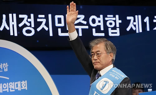 | △ 인사하는 새정치민주연합 문재인 대표 (서울=연합뉴스) 이상학 기자 = 새정치민주연합 새 당대표에 선출된 문재인 의원이 8일 서울 송파구 올림픽체조경기장에서 열린 제1차 정기전국대의원대회에서 수락 연설을 마친 뒤 손을 들어 인사를 하고 있다. 2015.2.8 leesh@yna.co.kr |