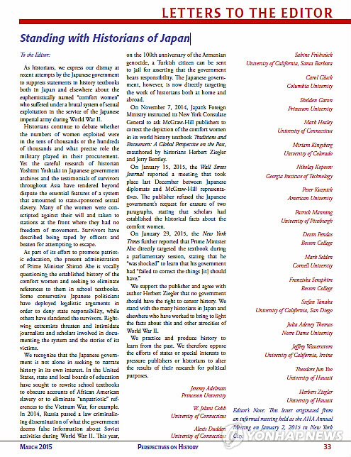 이에 대해 미국 역사협회 소속 역사학자 19명은 지난 5일(현지시간) 집단성명을 발표하고 "우리는 최근 일본 정부가 2차 세계대전 당시 일본 제국주의에 의한 성 착취의 야만적 시스템하에서 고통을 겪은 일본군 위안부에 대해 일본과 다른 국가의 역사교과서 기술을 억압하려는 최근의 시도에 경악을 금치 못한다"고 비판했다.