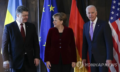 | △ 우크라 사태 진전 있어야 할텐데… (AP=연합뉴스) 독일 뮌헨에서 7일(현지시간) 열린 안보회의에서 페트로 포로셴코 우크라이나 대통령(왼쪽부터)과 앙겔라 메르켈 독일 총리, 조 바이든 미국 부통령이 회의가 시작되기 전 포즈를 취하고 있다. marshal@yna.co.kr |