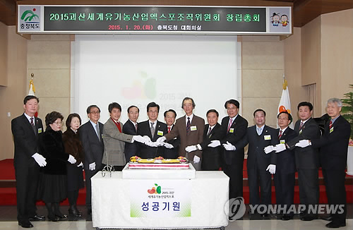 | △ 괴산 세계 유기농 산업엑스포 조직위 출범 (청주=연합뉴스) 심규석 기자 = '2015 괴산 세계 유기농 산업엑스포' 조직위원회가 지난달 20일 출범했다. 오는 9월 18일부터 10월 11일까지 괴산군 유기농엑스포농원에서 열리는 이 엑스포는 충북도와 괴산군, 세계유기농업학회(ISOFAR)가 공동 개최한다. 2015.2.9 <<충북도 제공>> ks@yna.co.kr |