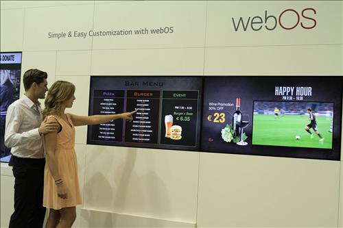 웹OS 디지털 사이니지는 스마트폰, 태블릿 PC 등 스마트 기기와 연동하는 솔루션을 제공한다. 메뉴, 가격, 영양정보 등 수시로 바꿔야 하는 정보를 업데이트할 수 있고 와이파이(wi-fi)도 연결된다.