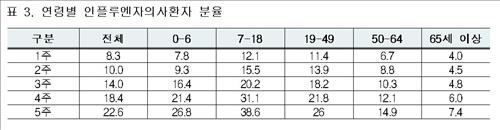 인플루엔자 유행 정도는 특히 영유아나 아동청소년층에서 컸다. 외래환자 1천 명당 환자수는 7~18세에서 38.6명으로 가장 높았고 0~6세 26.8명, 19~49세 26.0명, 50~64세 14.9명 등으로 유행기준보다 높았다.