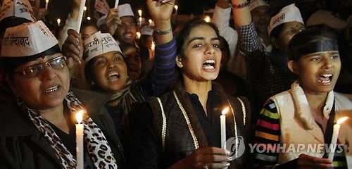 | △ 인도 반부패신당 아마드미당(AAP) 지지자들이 지난해 12월 8일(현지시간) 뉴델리에서 ‘우버’ 승객 성폭행 사건에 항의하는 시위를 벌이고 있다. (EPA=연합뉴스) |