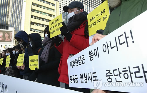 | △ 거리로 나선 대학원생들 (서울=연합뉴스) 김주성 기자 = 전국대학원총학생회협의회 소속 대학원생들이 지난 7일 오전 서울 광화문광장에서 '대학원 등록금 인상 전가 중단 및 교육비 경감 촉구' 기자회견을 열고 '입학금 상한제 도입', '수료연구등록금 폐지', '취업 후 학자금상환대출제도 허용' 등을 요구하고 있다. |