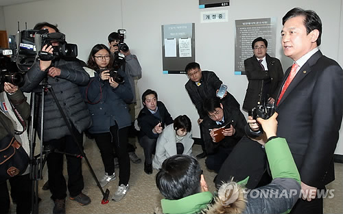 | △ '도민들께 보답하겠다' (청주=연합뉴스) 김형우 기자 = 9일 청주지법 형사합의 11부(이관용 부장판사)로부터 기부행위 등 혐의(지방교육 자치에 관한 법률 위반)에 대해 무죄를 선고받은 김병우 충북도교육감이 재판장을 나서며 취재진의 질문에 답하고 있다. 이 자리에서 김 교육감은 "걱정해주신 도민들께 보답하겠다"고 밝혔다. 2015.2.9 vodcast@yna.co.kr |
