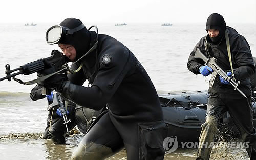 | △ 한미 해병대, 강화도서 첫 해상침투훈련 (서울=연합뉴스) 10일 강화도 하일리 해안에서 열린 한미 해병대 연합 해상침투훈련에서 상륙해안에 접안한 한미 해병대 장병들이 내륙으로 은밀히 기동하고 있다. 2015.2.10 << 해병대사령부 제공 >> photo@yna.co.kr |