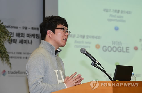 | △ '온라인 해외마케팅 전략 세미나' (서울=연합뉴스) 10일 서울 강남구 삼성동 트레이드타워에서 한국무역협회 주최로 열린 '트레이드코리아 온라인 해외 마케팅 전략 세미나'에서 윤성의 구글코리아 차장이 구글을 활용한 수출판로 확대전략에 대해 설명하고 있다. (무협 제공) |