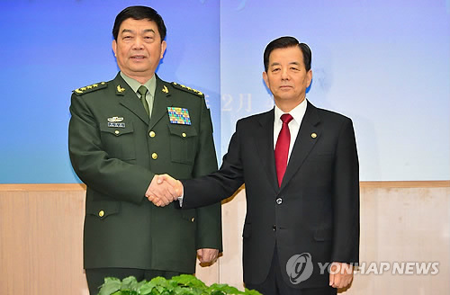 | △ 손잡은 한중 국방장관 (서울=연합뉴스) 이지은 기자 = 한민구 국방부 장관(오른쪽)과 창완취안(常萬全) 중국 국방부장이 4일 오후 서울 용산구 국방부에서 열린 한중 국방장관 회담에서 악수를 하며 기념촬영하고 있다. 2015.02.04 jieunlee@yna.co.kr |