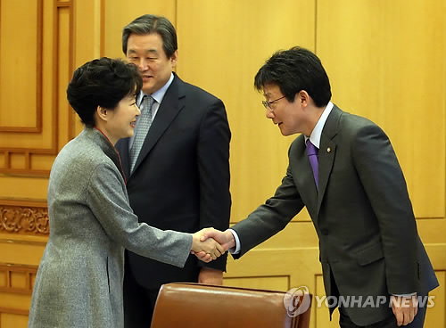 | △ (서울=연합뉴스) 도광환 기자 = 박근혜 대통령이 10일 오전 청와대를 방문한 새누리당 지도부와의 접견에서 유승민 원내대표와 악수하고 있다. |
