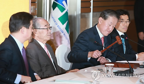 | △ (서울=연합뉴스) 박동주 기자 = 10일 서울 여의도 전경련회관에서 회원 기업 대표 200여명이 참석한 가운데 열린 제54회 전국경제인연합회 정기총회에서 허창수 회장이 개회를 알리고 있다. |