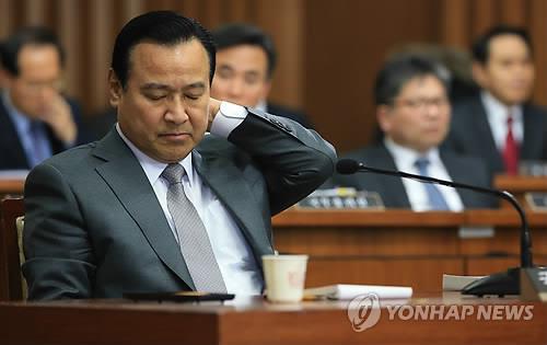| △ 녹취록 여야 공방 총리 후보자 청문회 (서울=연합뉴스) 홍해인 기자 = 이완구 총리 후보자가 10일 오후 서울 여의도 국회에서 열린 인사청문회에서 여야 의원들간 최근 기자들과 이 후보자가 사석에서 주고받은 대화 내용이 담긴 녹취록 음성 파일 공개 여부에 대한 공방이 오가자 눈을 감은 채 뒷목을 잡고 있다. |
