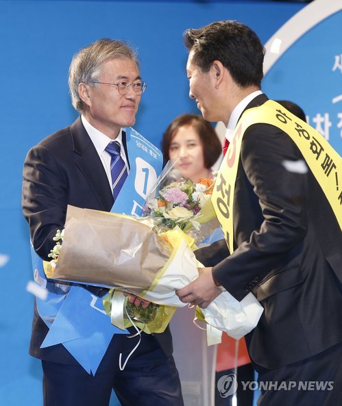 | △ 축하받는 문재인 대표 (서울=연합뉴스) 이상학 기자 = 새정치민주연합 새 당대표에 선출된 문재인 의원이 8일 서울 송파구 올림픽체조경기장에서 열린 제1차 정기전국대의원대회에서 정청래 최고위원의 축하를 받고 있다. 2015.2.8 leesh@yna.co.kr |