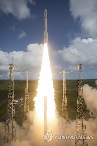| △ (EPA=연합뉴스) 유럽우주기구(ESA)의 소형 무인 우주왕복선 IXV가 11일(현지시간) 프랑스령 기아나 우주센터에서 베가 VV04 로켓에 실려 발사되고 있다. |