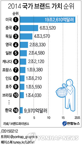 (서울=연합뉴스) 현혜란 기자 = 한국의 브랜드 가치는 9천970억 달러로 집계돼 세계 16위 자리를 지켰다.