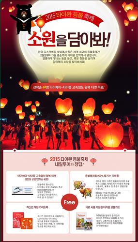 등롱, 축제 기념품, 타이중 특산물, 불꽃쇼 관람권 등 축제를 만끽할 수 있는 경품도 제공하고 등불 축제가 열리는 곳에서 가까운 호텔에서 숙박한다. 서울과 부산에서 모두 출발 가능하며, 상품 가격은 39만9천원부터다.