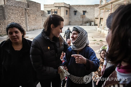 | △ 유엔난민기구(UNHCR) 특별대사인 안젤리나 졸리(왼쪽에서 두번째)가 지난달 25일(현지시간) 이라크 알쿠시 지역에서 북부 모술에서 쫓겨난 기독교 난민을 만나 위로하고 있다. (EPA=연합뉴스 자료사진) |