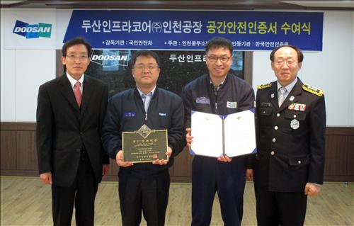 (서울=연합뉴스) 현윤경 기자 = 두산인프라코어[042670]는 자사 인천공장이 국민안전처의 공간안전인증을 획득했다고 12일 밝혔다.