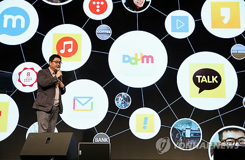 | △ 지난해 10월 1일 오전 서울 중구 웨스틴조선호텔 그랜드볼룸에서 열린 다음커뮤니케이션(다음)과 카카오의 합병법인인 '다음카카오'의 공식 출범 기자간담회에서 이석우 공동대표가 사업 방향과 관련해 발표하고 있다. |