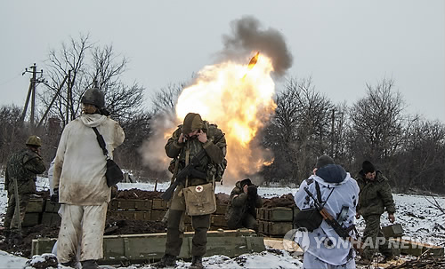 | △ 11일(현지시간) 우크라이나 동부 데발체베 동북부 산차리브카 마을 외곽에서 친러 분리주의 반군이 정부군 진지를 향해 박격포를 발사하면서 귀를 막고 있다. (AP=연합뉴스) |