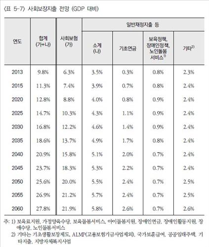 대신 고령화의 심화로 기초연금의 GDP 대비 비중은 2013년 0.3%에서 2060년 2.6%로 늘어날 것으로 예측됐다.