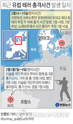 | △ <그래픽> 최근 유럽 테러 총격사건 발생 일지(종합) (서울=연합뉴스) 반종빈 기자 = 밸런타인데이를 겸한 주말인 14∼15일(현지시간) 덴마크 코펜하겐 시내에서 약 10시간 간격으로 두 차례의 총격 사건이 발생하면서 2명이 숨지고 5명이 부상했다. 덴마크 경찰은 15일 오전 도심 다문화 지역인 노레브로에서 두 사건의 용의자로 보이는 남성 1명을 사살했다고 밝혔다. bjbin@yna.co.kr 페이스북 tuney.kr/LeYN1 트위터 @yonhap_graphics |