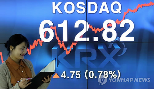 | △ 코스닥, 6년8개월만에 610선 등정 (서울=연합뉴스) 16일 서울 여의도 한국거래소에서 관계자가 코스닥 전광판 앞을 지나고 있다. 이날 코스닥은 6년 8개월 만에 610선을 돌파했다. 코스닥지수가 610선을 넘은 것은 2008년 6월 19일(610.99) 이후 처음이다. |