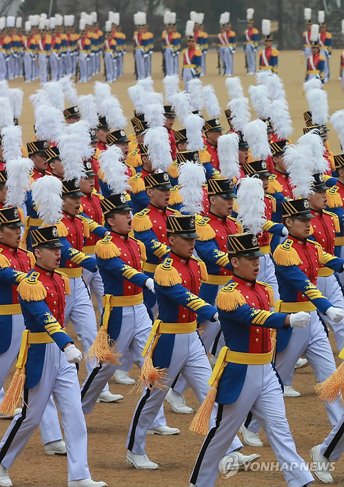 | △ 늠름한 입장 (서울=연합뉴스) 박동주 기자 = 16일 오전 서울 노원구 육군사관학교에서 열린 육사 75기 입학식 및 재학생 진학식에서 신입생도들이 입장하고 있다. 2015.2.16 pdj6635@yna.co.kr |